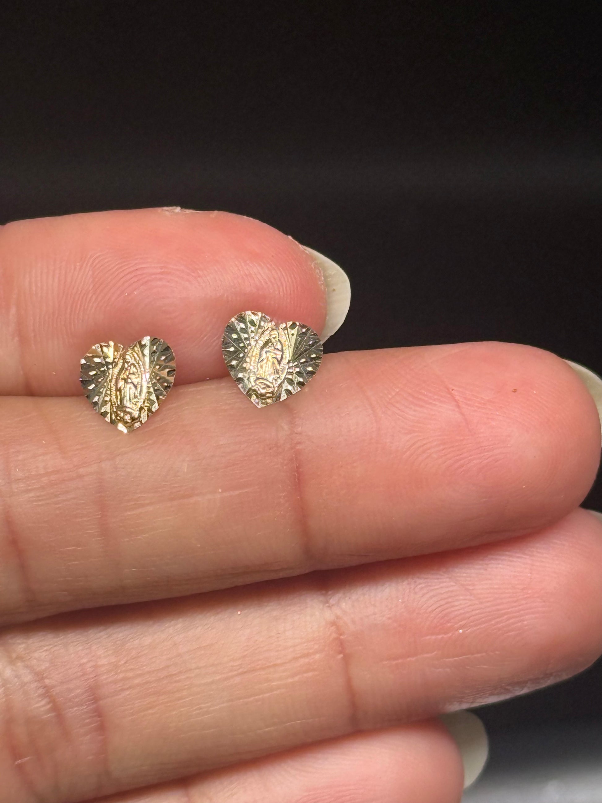 Eleva tu fe y tu estilo con estos delicados aretes en forma de corazón, grabados con la imagen de la Virgen. Su acabado diamantado resalta la luz y crea un brillo precioso en cada movimiento.