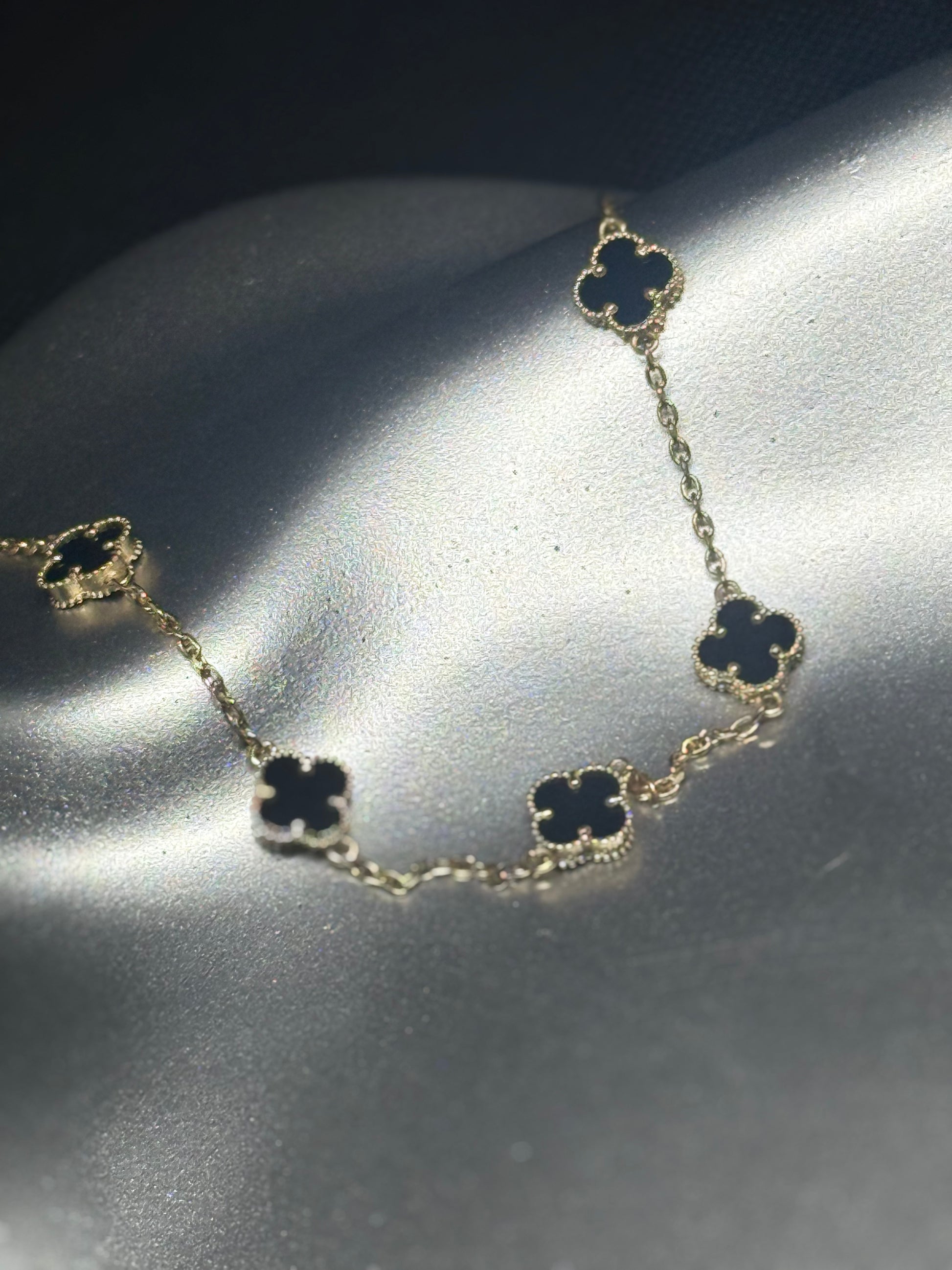 A luxury essential made in real 14K solid gold. This bracelet features five black clover charms, each outlined with fine beaded detail that adds an elegant, high-end finish. Perfect for everyday wear or layering with your favorite gold pieces.