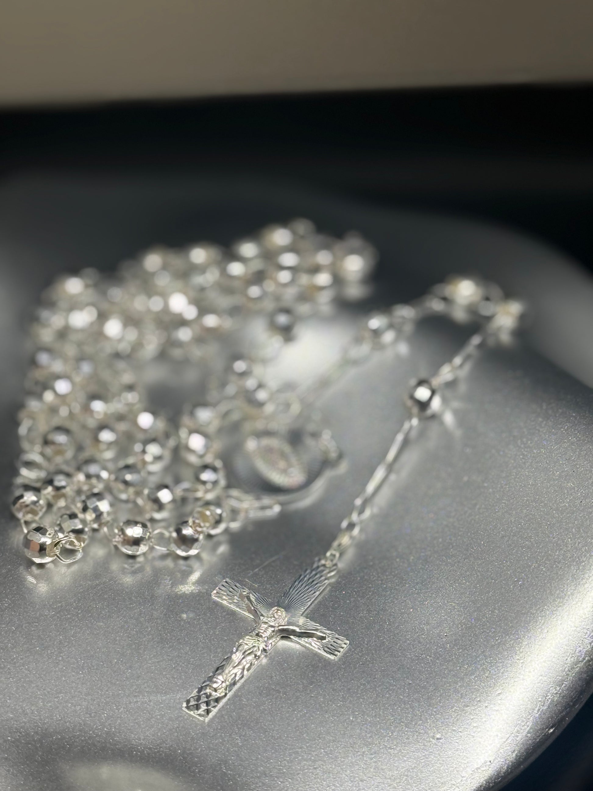 Simple, elegant, and full of devotion. Crafted in genuine sterling silver, this rosary offers a sleek shine with beautifully spaced beads and a finely detailed cross. Perfect for daily prayer or as a meaningful gift.